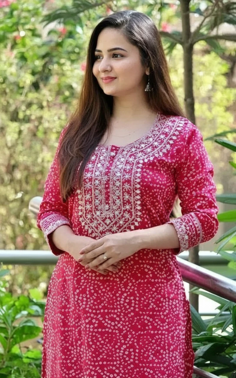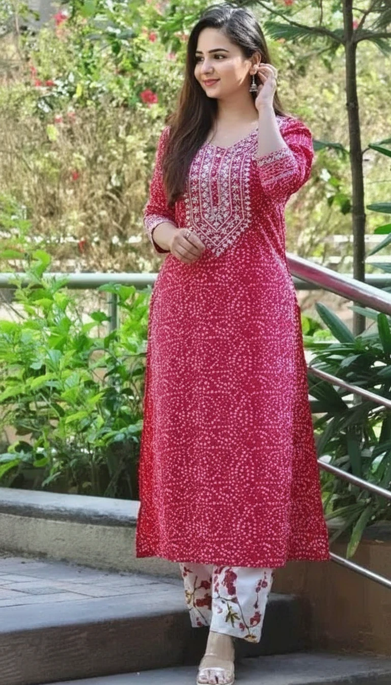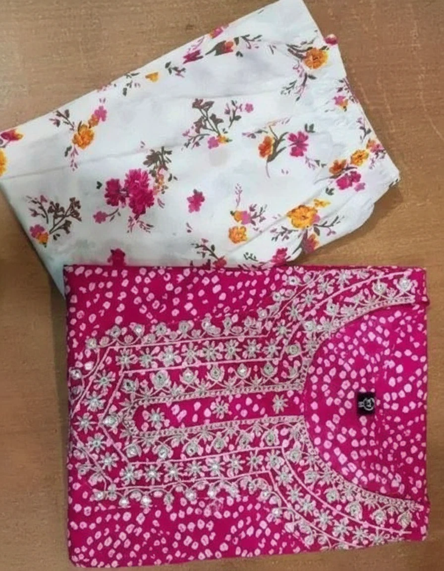 Step out in style with this Bandhani Print Kurta Set featuring 3-4th sleeves. Made from soft cotton with intricate embroidery, the pink kurta paired with white bottoms offers a classic yet trendy look. Perfect for parties, festive occasions, or casual outings, this comfortable and breathable set ensures you look elegant and feel confident.