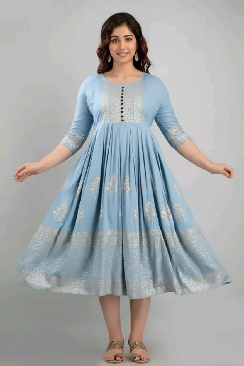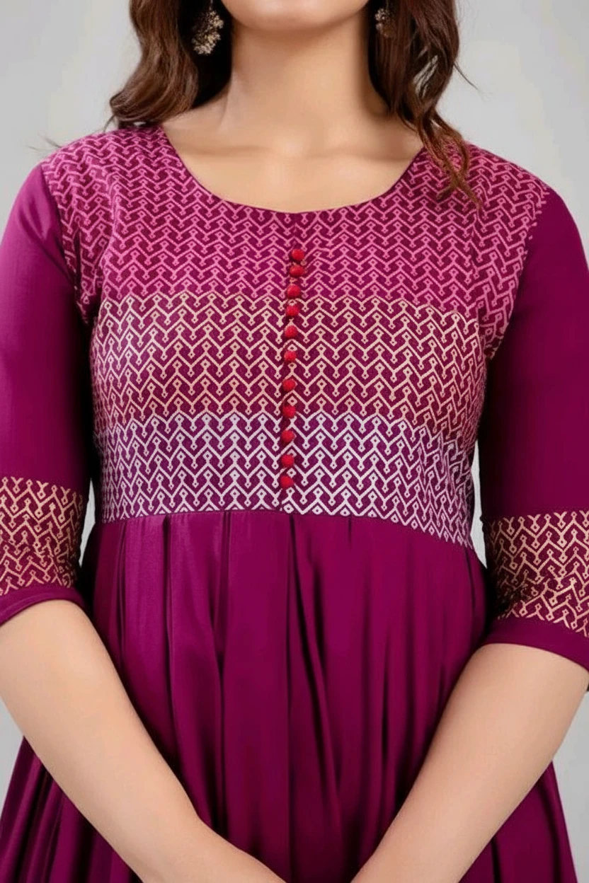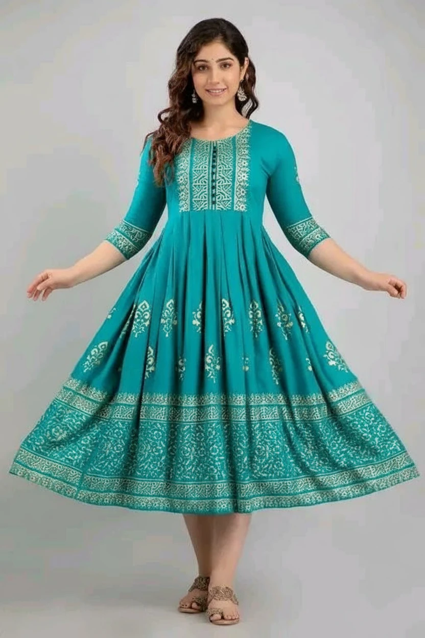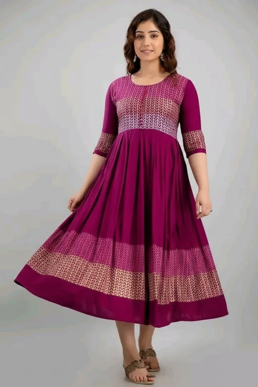 Add elegance to your everyday wardrobe with the Women Rayon Printed Aaradhya Anarkali Kurti. Featuring three-quarter sleeves, a round neck, and a flared hemline, this lightweight rayon kurti is perfect for casual outings or ethnic occasions. Pair it with jeans, palazzos, or straight pants for a comfortable, stylish look that stands out.