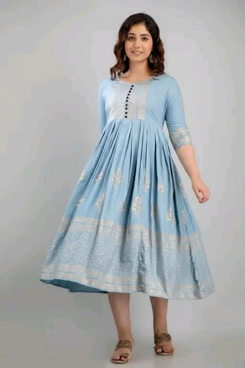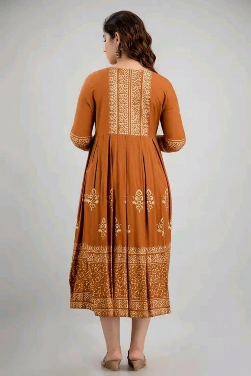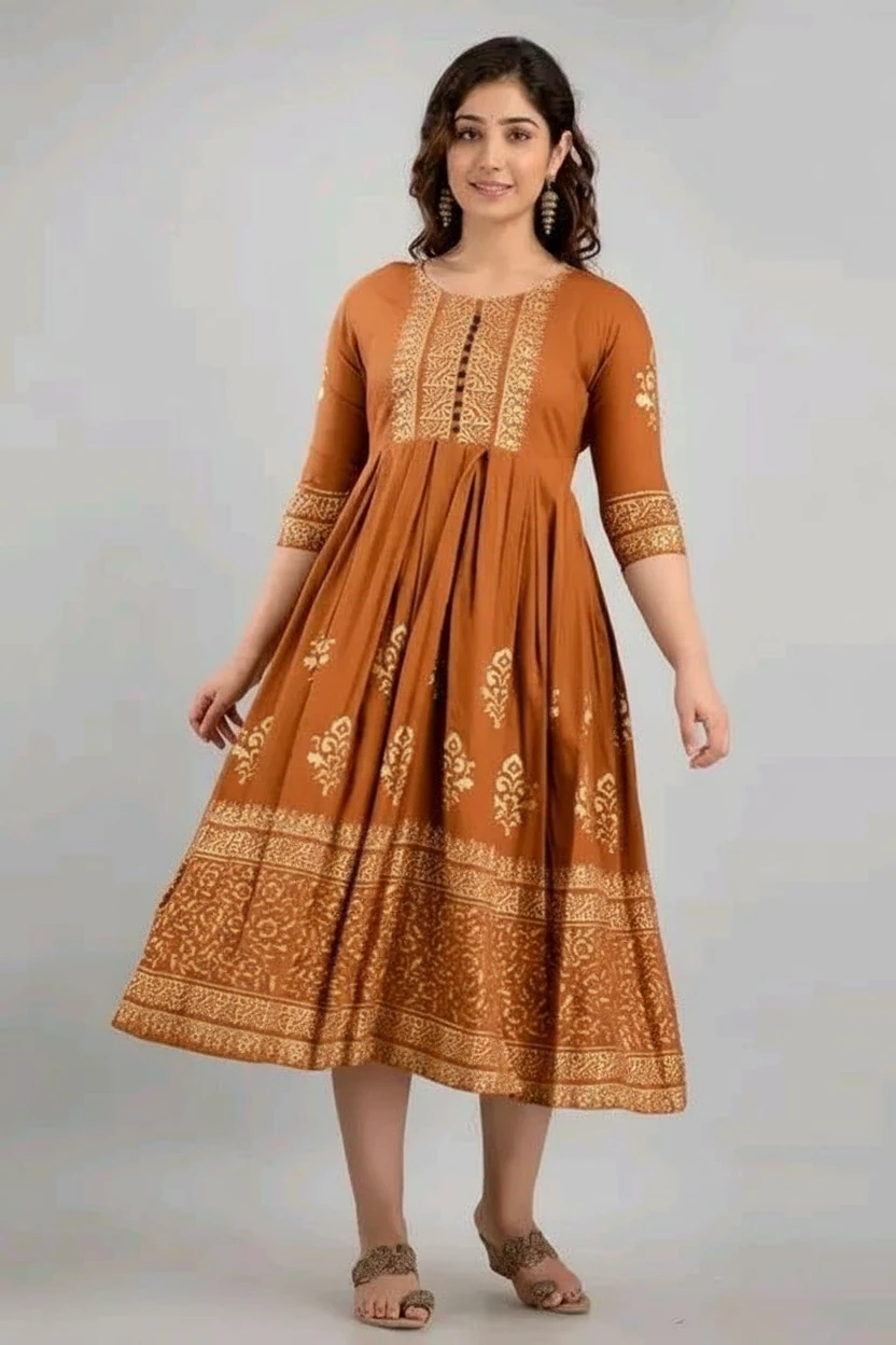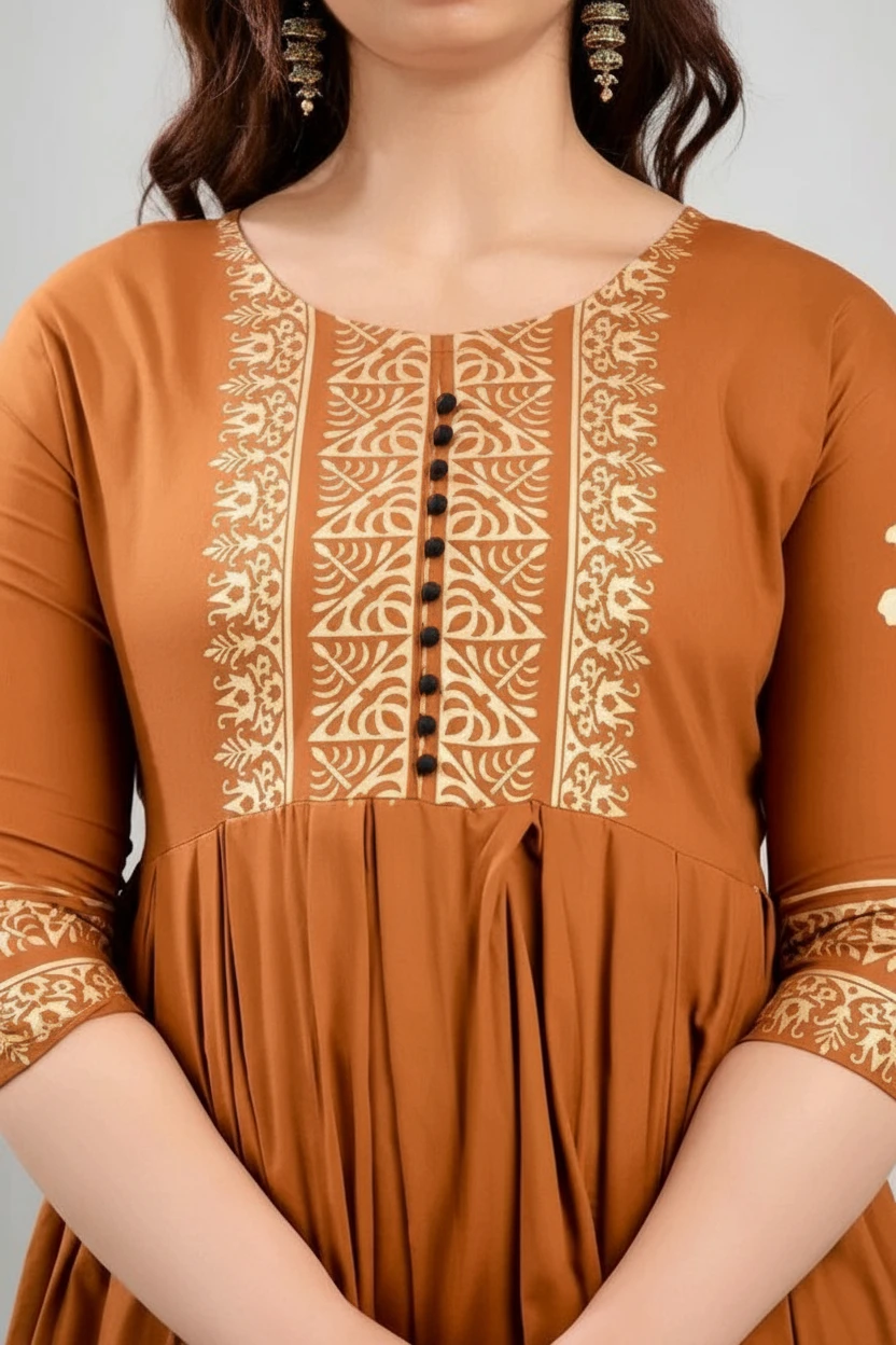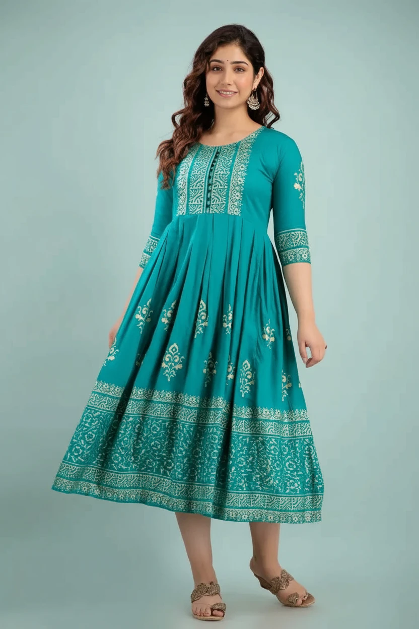 Add elegance to your everyday wardrobe with the Women Rayon Printed Aaradhya Anarkali Kurti. Featuring three-quarter sleeves, a round neck, and a flared hemline, this lightweight rayon kurti is perfect for casual outings or ethnic occasions. Pair it with jeans, palazzos, or straight pants for a comfortable, stylish look that stands out.